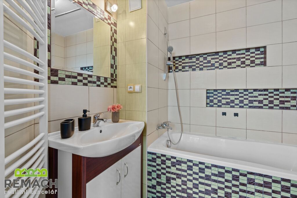 Byt je částečně zařízený, což poskytuje novým nájemníkům flexibilitu v zařizování dle jejich vlastního stylu a potřeb. Kuchyně je vybavena linkou, která nabízí dostatek úložného prostoru a pracovní plochy pro každodenní vaření. Obývací pokoj je prostorný a světlý, ložnice s balkonem s orientací na jižní stranu je ideálním místem pro ranní kávu nebo večerní posezení.