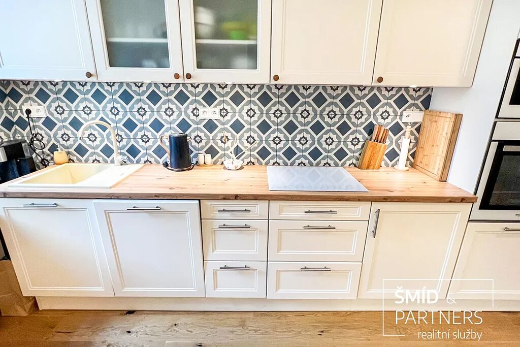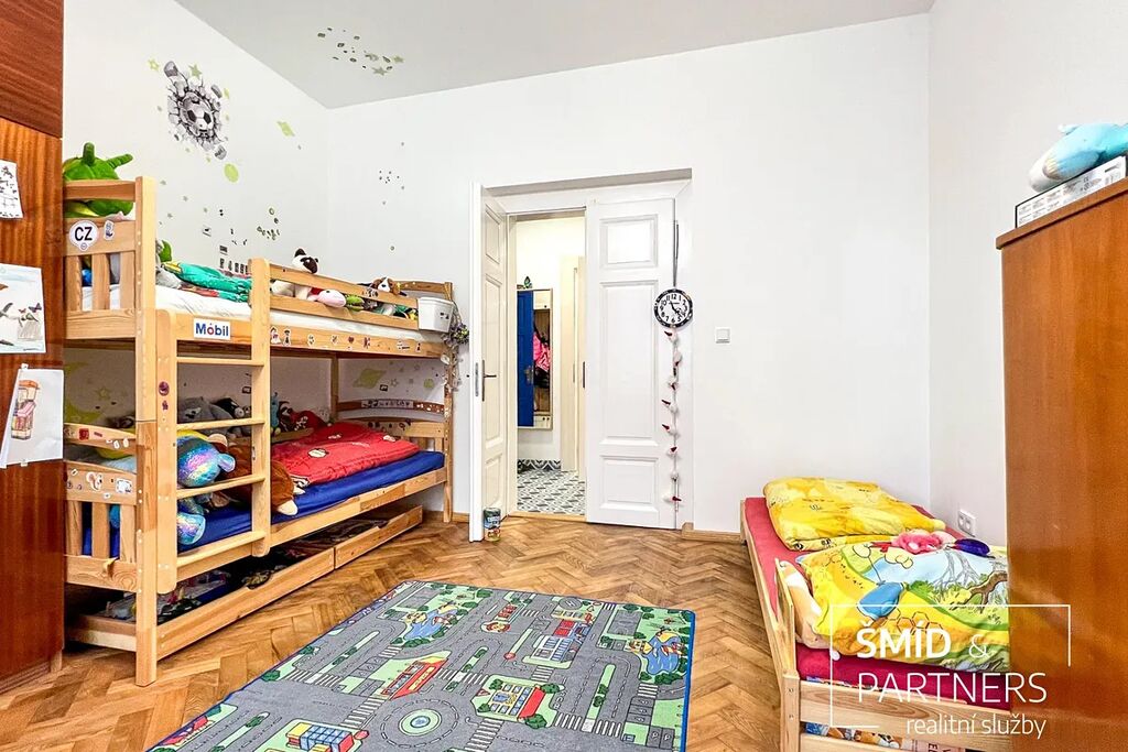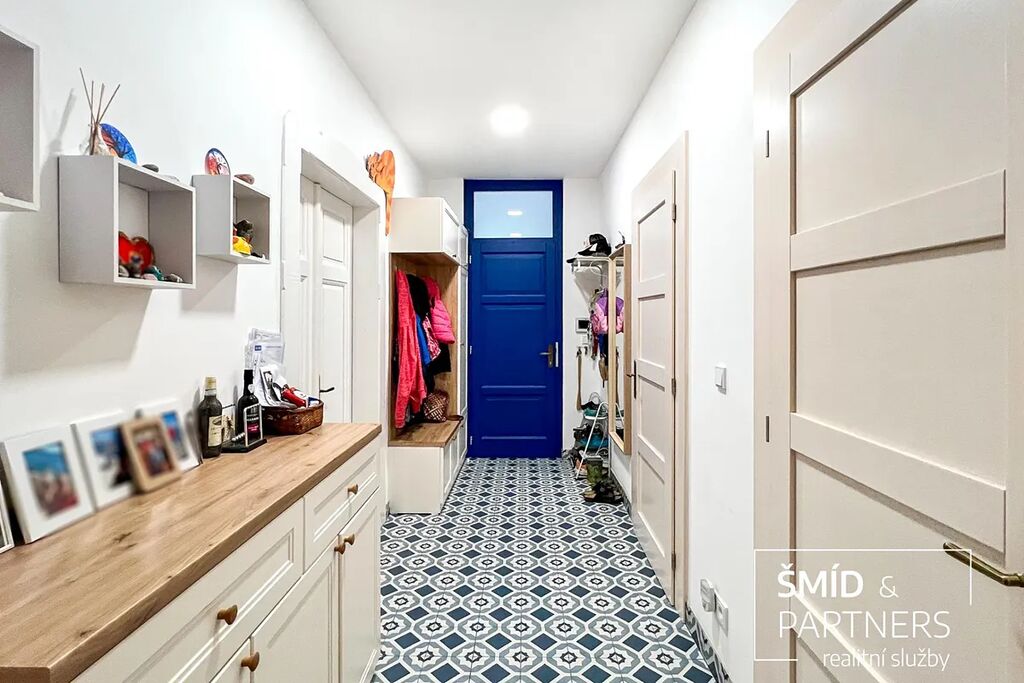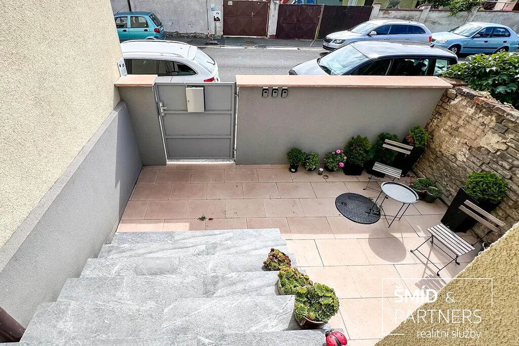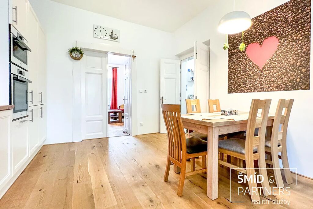 Tento byt má výhled jak do zahrady, která je k dispozici všem vlastníkům jednotek, tak do poklidné ulice. Byt je prostorný a díky velkým oknům a světlému interiéru příjemně prosluněný. Je zde jasně vidět spolupráce s architektkou, vznikl velice vkusný a praktický byt, kde je dětský pokoj, obývací pokoj, ložnice, krásná kuchyň, koupelna a WC. Nejčastěji používaný materiál je zde dřevo, vč. podlahové krytiny, díky tomu působí byt příjemným a teplým dojmem. Celkově byl při rekonstrukci domu kladen důraz na kvalitu použitých materiálů.