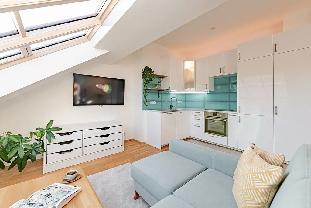 Dispozici tvoří útulný pokoj s kuchyňskou linkou na míru, kde naleznete jak obývací část se sezením a TV, tak i jídelní část. Z obývacího pokoje se vchází do ložnice, s praktickou vestavnou šatnou. Úložné prostory jsou řešeny jednak skříněmi, jednak vestavěnými úložnými prostory ve zkosených částech bytu.