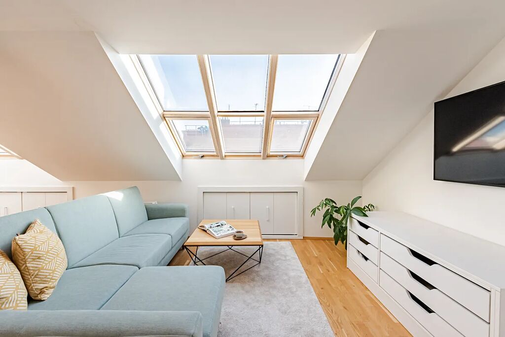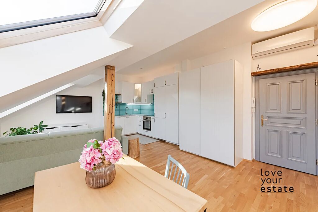 Ve výhradním zastoupení majitele nabízíme plně zařízený a klimatizovaný byt ve 6. podlaží o dispozici 2kk/54m2 se sklepem. Jedná se o krásný zrekonstruovaný secesní dům v srdci pražských Nuslí s výtahem. Předností bytu jsou velkorysá atelirová střešní okna v celé délce slunného bytu.