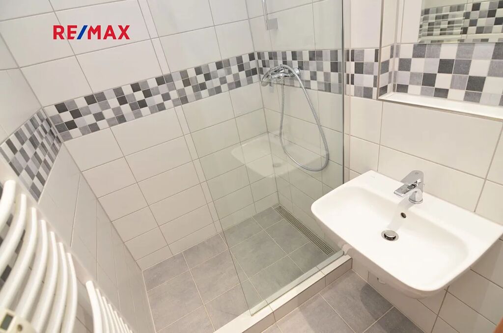 Koupelna se sprchovým koutem. WC zvlášť. Komora s prostorem pro pračku.