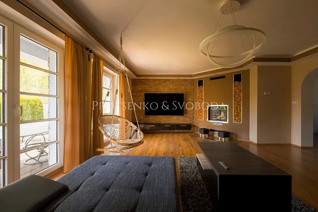 Z obývací části je přímý vstup na venkovní terasu, která je díky elektricky ovládané markýze chráněna před přímým sluncem — ideální prostor pro letní stolování nebo odpočinek s výhledem do upravené zahrady.