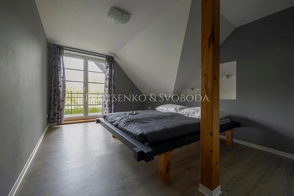 Ve druhém nadzemním podlaží najdete celkem čtyři místnosti — ložnici s vlastní šatnou, dětský pokoj, pracovnu a pokoj pro hosty. Dále je zde sklad (komora) a prostorná koupelna vybavená vanou, sprchovým koutem a toaletou. Úložné prostory jsou zde řešeny s důrazem na praktičnost a pohodlí.