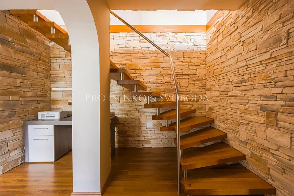 V přízemí domu se nachází rozsáhlá obytná zóna — propojený obývací pokoj, kuchyňský kout a jídelní část vytvářejí vzdušný prostor vhodný pro každodenní rodinný život i společenské setkávání. Dominantou interiéru je elegantní krbová vložka, která dodává místnosti nejen teplo, ale i atmosféru. Dále se zde nachází koupelna se sprchou, samostatná toaleta, garáž s přímým vstupem do domu a praktická technická místnost.