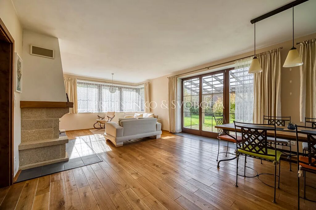 - Přízemí tvoří prostorný obývací pokoj s krbem, propojený s jídelnou a kuchyní s přímým vstupem na zahradu a terasové posezení.