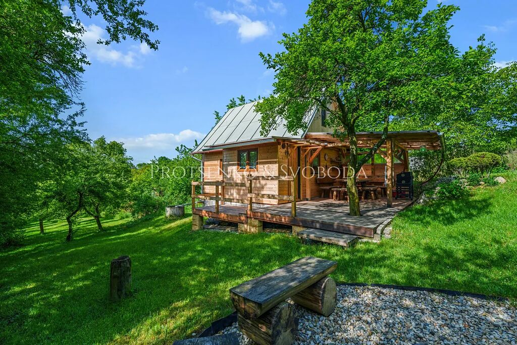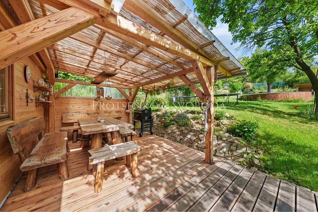 Pozemek je obklopen vzrostlou zelení a nabízí soukromí i výhledy do přírody. Nachází se zde bazén s pískovou filtrací(průměr 4,6 m, částečně zakopaný ve svahu), trampolína (průměr 4,3 m, bez sítě), ohniště se sezením z masivního kamene a bohatě osázený sad – třešně, jabloně, hrušně, švestky, ořechy (vlašské i lískové), ale také šípky, lesní jahody a medvědí česnek. Sad nebyl chemicky ošetřován a je tak ideálním základem pro přírodní zahradničení či dětské hry.