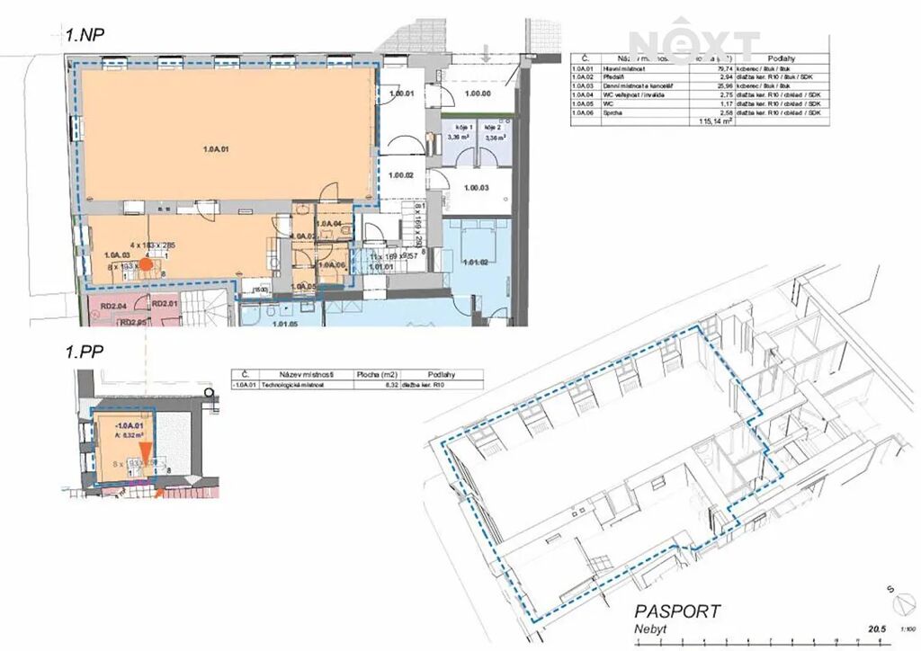 Vchod do nebytového prostoru je situován z ulice Masarykova. Užitná plocha činí 123,46 m2. Dle projektové dokumentace bude mít prostor následující podobu: 1.NP - předsíň (2,94 m2), hlavní místnost (79,74 m2), 2x WC (2,75 m2 a 1,17 m2), sprcha (2,58 m2), denní místnost a kancelář (25,96 m2). 1.PP - technologická místnost (8,32 m2). Vytápění a ohřev vody je zajištěn tepelným čerpadlem (vzduch, voda). Vstup do budovy bude bezbariérový.
