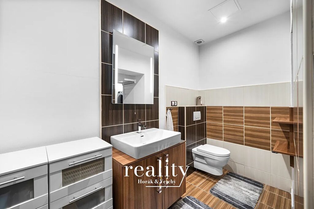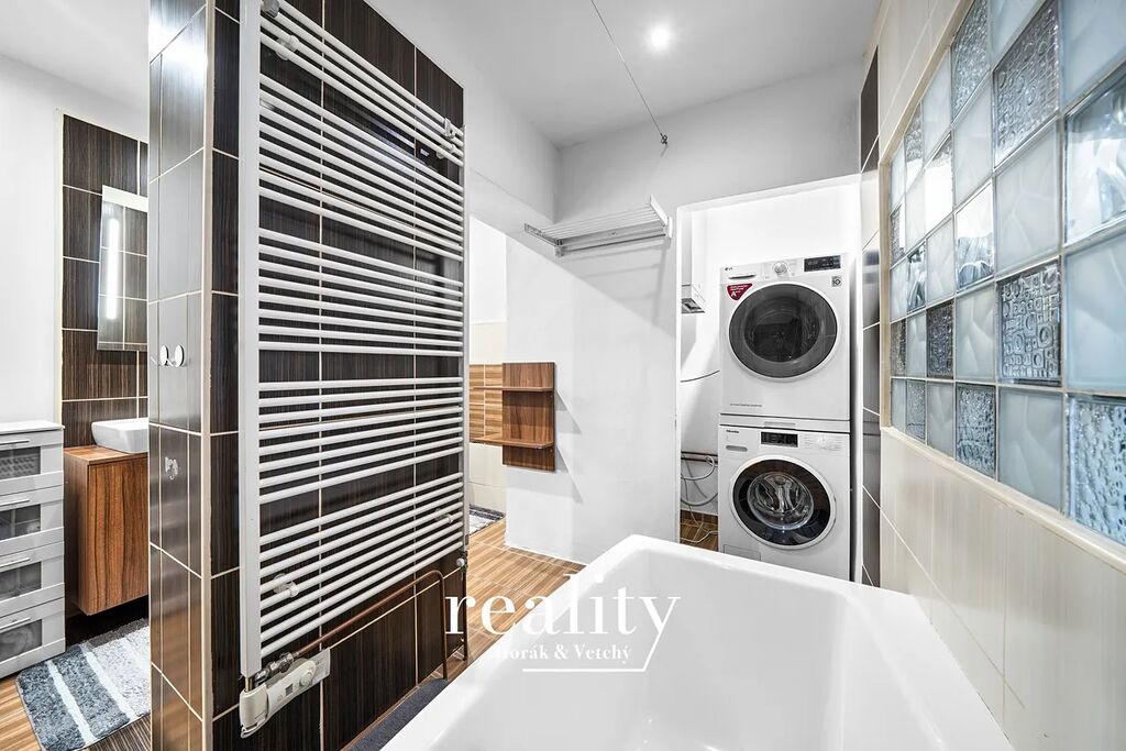 Designovka, které nic nechybí! Vana se sprchovým závěsem, toaleta, topný žebřík, sušák a to nejlepší? Kondenzační plynový kotel je elegantně schován, stejně jako prostor pro vaši pračku a sušičku, kterou si přivezete. Čistý vzhled, maximální funkčnost.