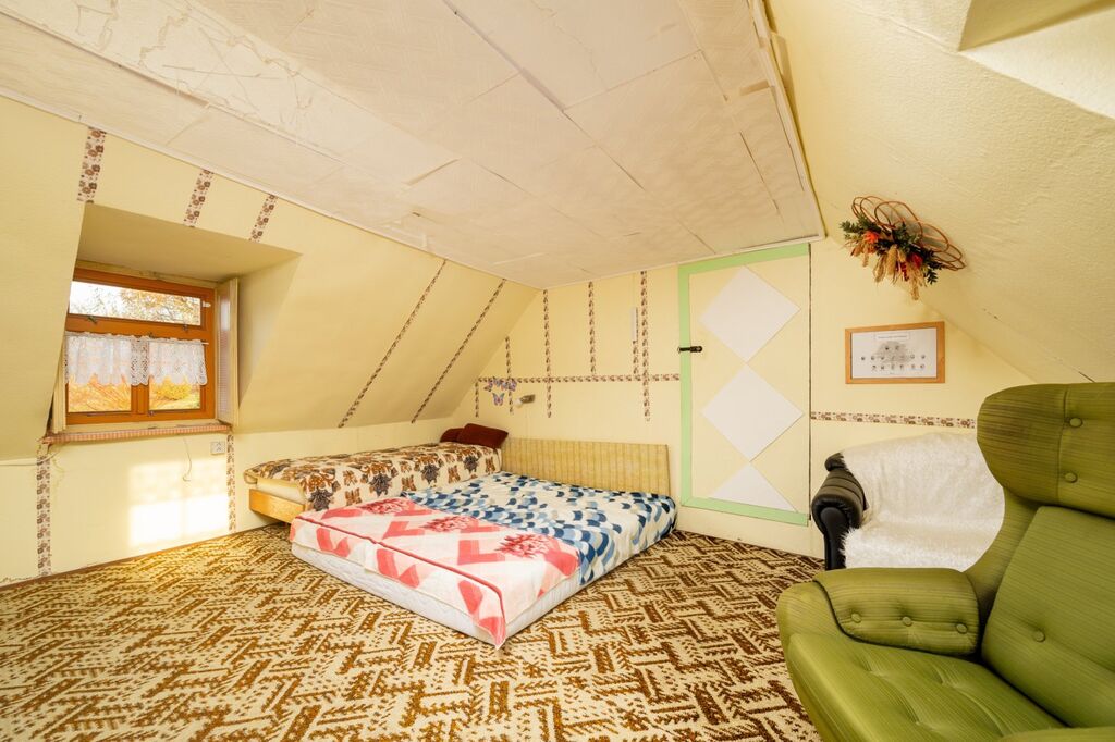 2. NP (Podkroví – cca 85 m²): Patro nabízí velkorysé ložnice: hlavní pokoj (28,0 m²) a druhý pokoj (23,5 m²). Půdní prostor nad garáží (23,9 m²) - tato část je stavebně připravena k vestavbě – nabízí se zde vybudování ateliéru, herny nebo samostatného apartmánu pro hosty.