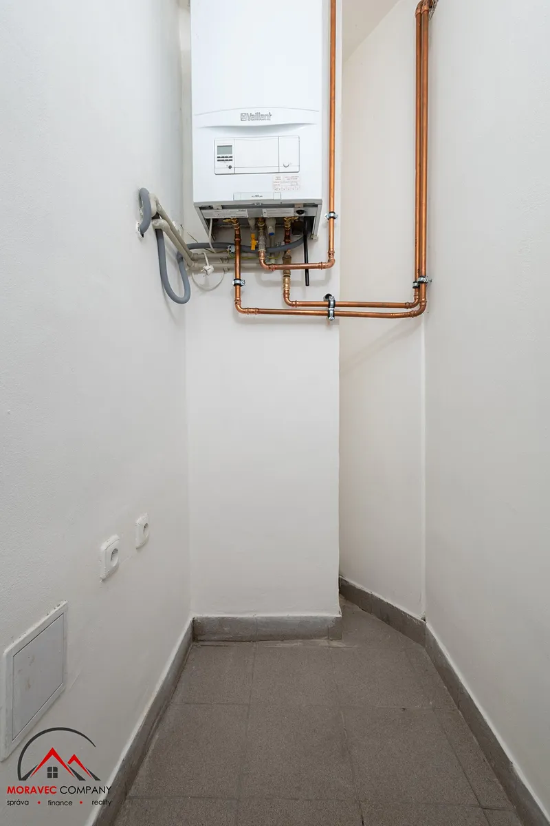 V bytě se nachází 2 samostatné pokoje a dále pokoj s kuchyňským koutem vybaveným elektrickým sporákem s varnou deskou a digestoří, a koupelna se sprchovým koutem a WC. Vytápění a ohřev vody je řešeno kombinovaným plynovým kotlem, umístěný v oddělené technické místnosti.