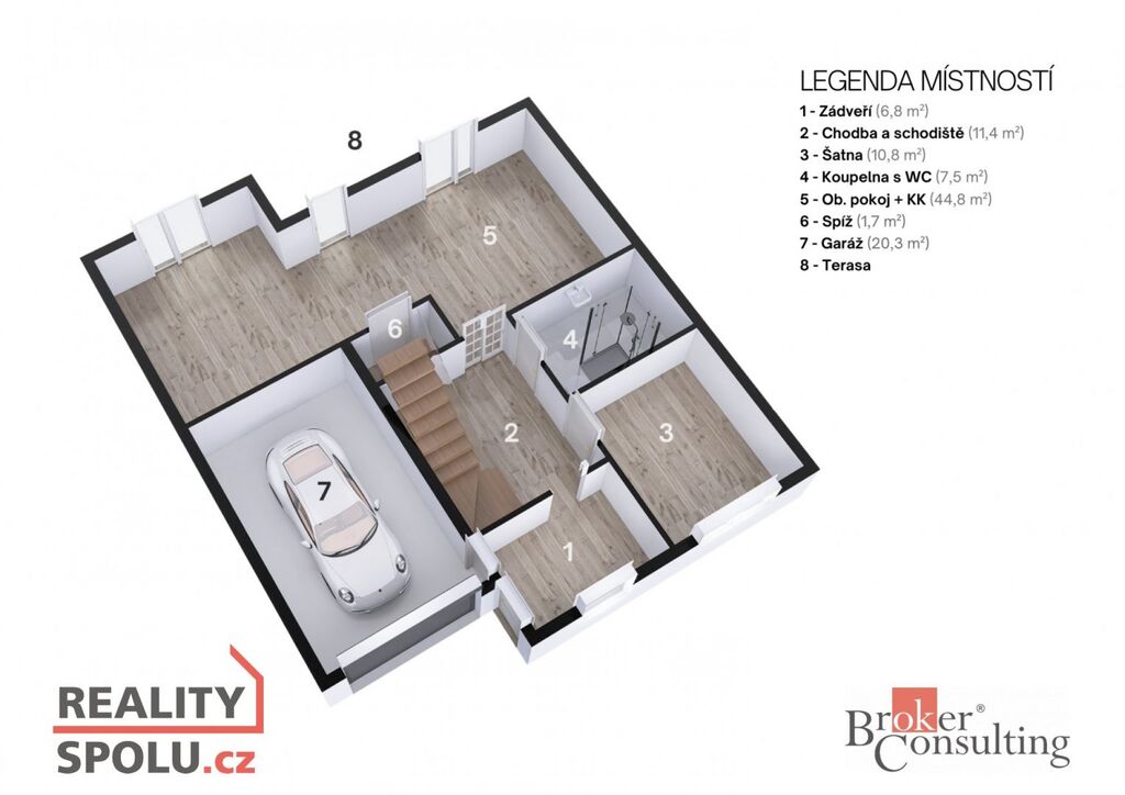 Součástí je také integrovaná garáž, která zvyšuje pohodlí a její plocha je 20m2. Před domem pohodlně zaparkují další dvě auta.