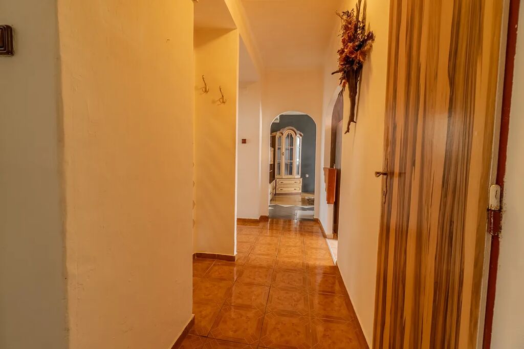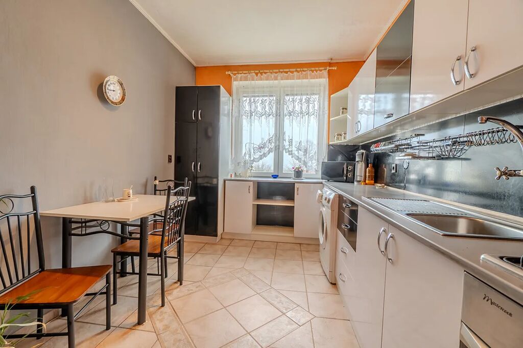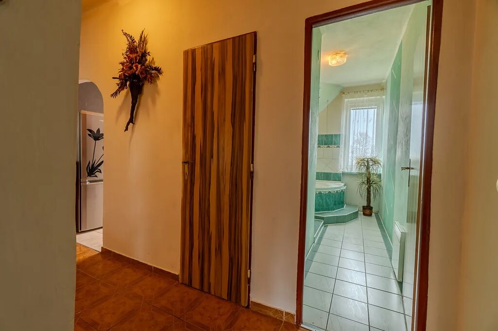 prostorná kuchyně s plynovým sporákem, světlý obývací pokoj se vstupem na balkón a s krbovými kamny, které slouží jako hlavní zdroj vytápění, dva další pokoje vytápěné elektrickými přímotopy, koupelna s rohovou vanou a samostatné WC, vstupní chodba a komora.