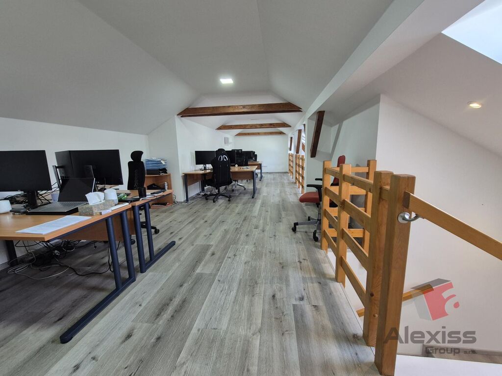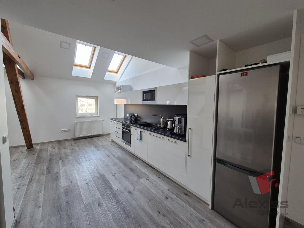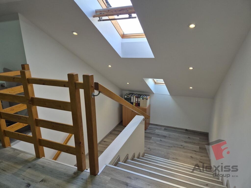 Všude jsou plovoucí podlahy, střešní okna krásně prosvětlující prostor, přiznané dřevěné trámy, moderní bílá kuchyňská linka vč. spotřebičů.