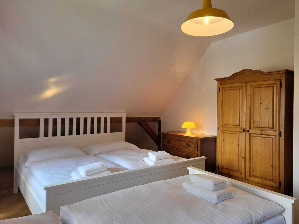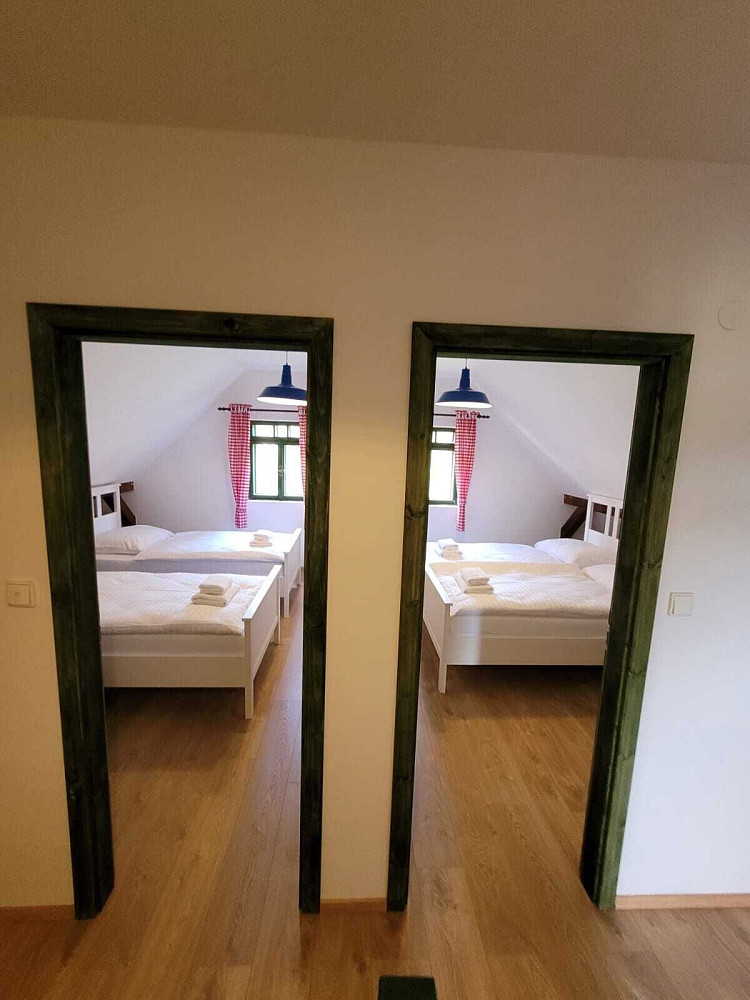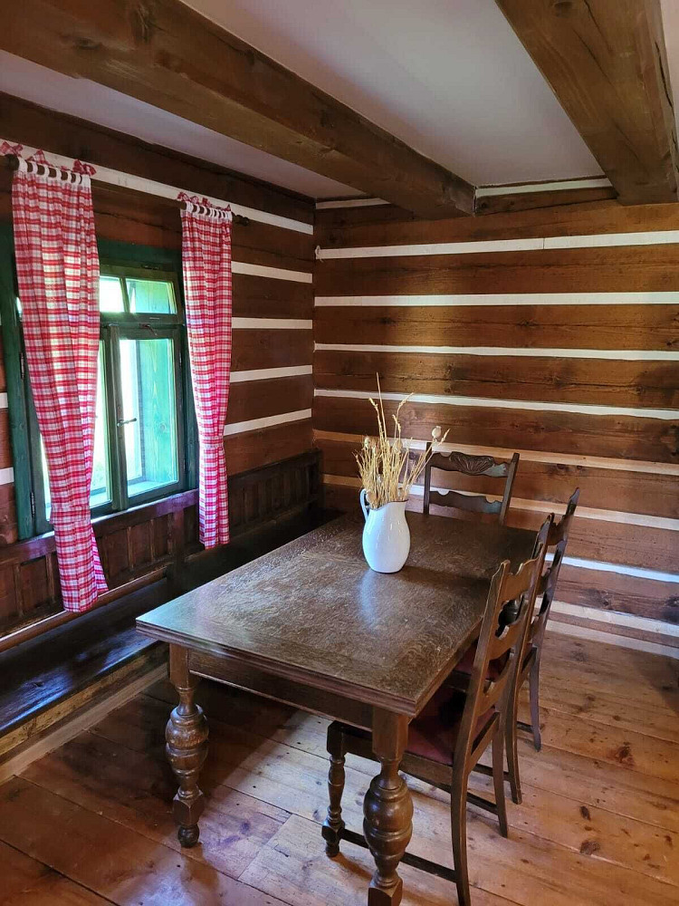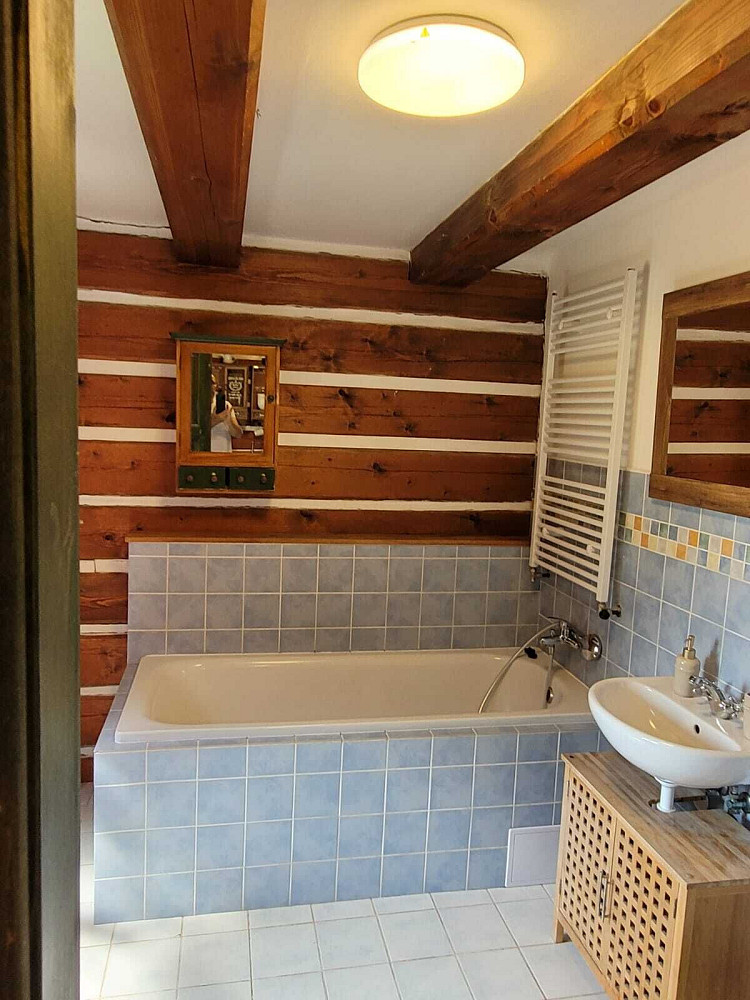 Přízemí roubenky nabízí obývací prostor, kuchyňský kout s kompletním vybavením včetně lednice a mikrovlnné trouby a 1 koupelnu. Koupelna je vybavená vanou. K dispozici jsou tři samostatné ložnice v patře.