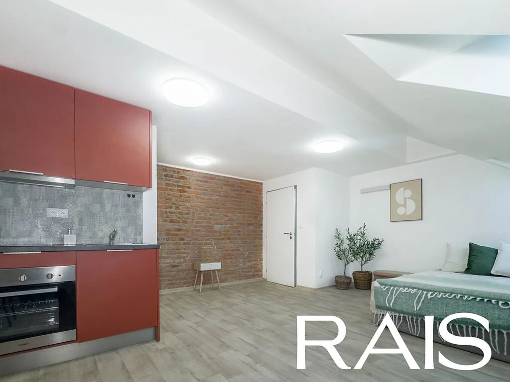 Podkrovní ateliérový prostor působí vzdušně a klidně, s příjemným výhledem na město. Velká koupelna je vybavena sprchovým koutem a nabízí dostatek místa včetně prostoru pro pračku. Kuchyňská linka je moderní, s vestavěnou lednicí, troubou a indukční varnou deskou.
