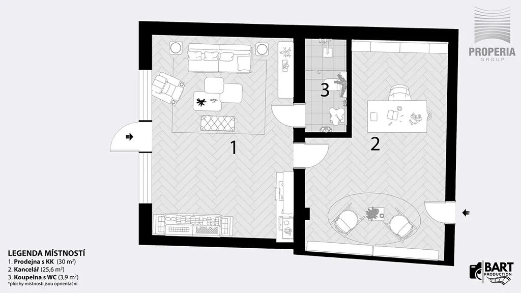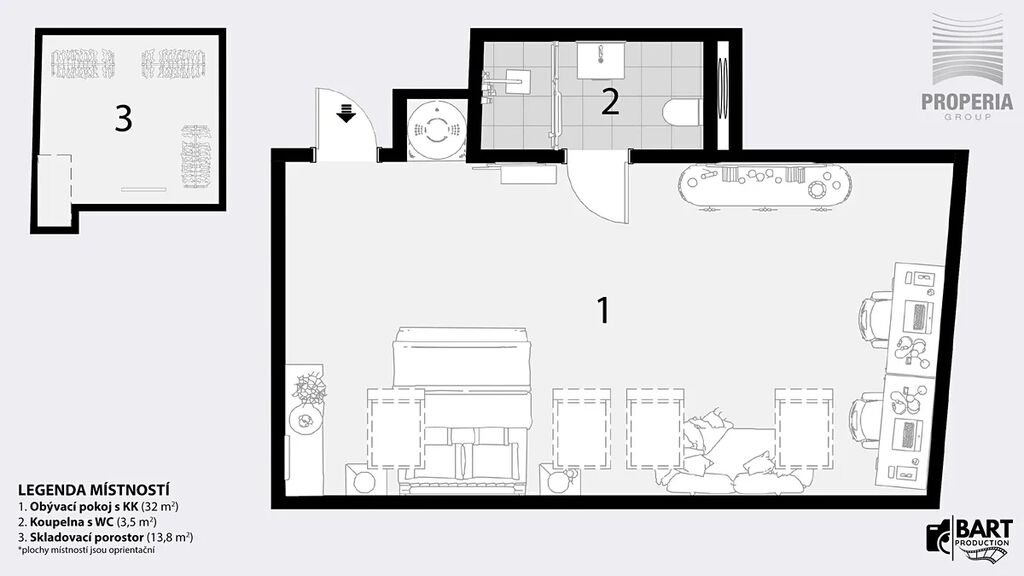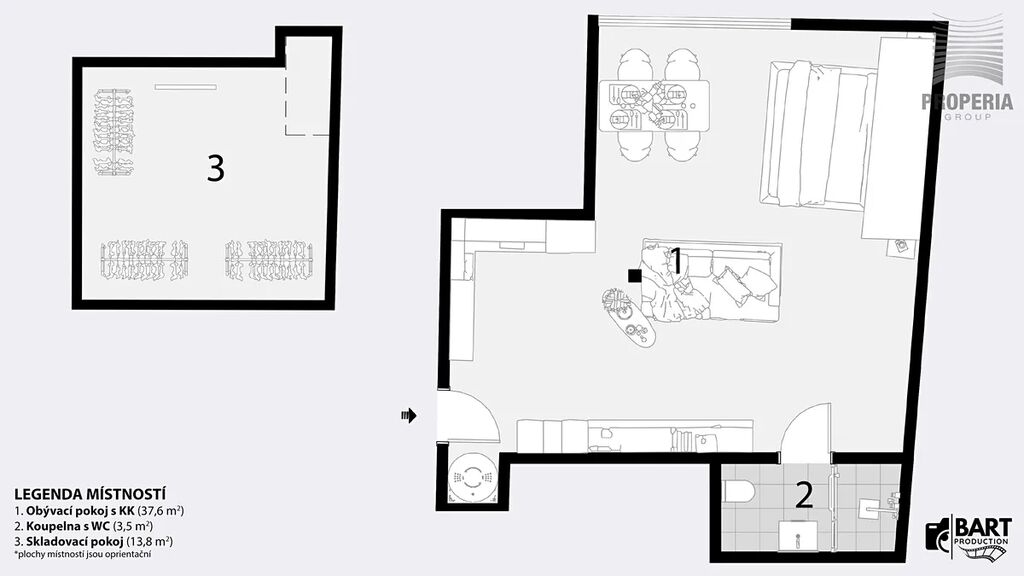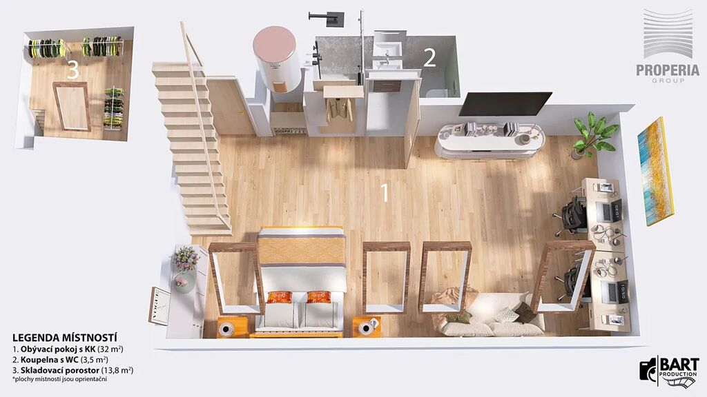 V 2NP jsou 2 byty, oba řešeny jako mezonet o dispozici 2+kk (každý o výměře 52 m2).