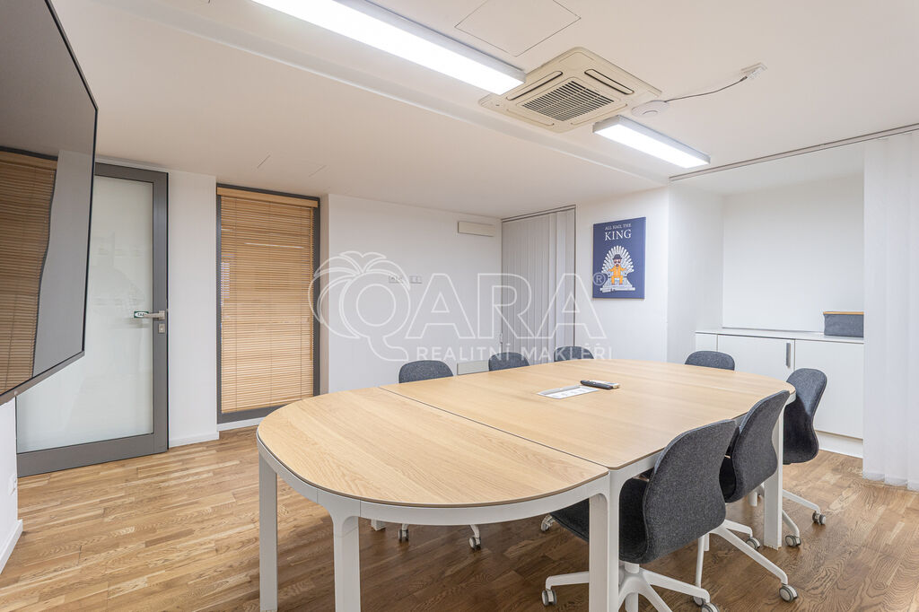 Prostor o celkové rozloze kanceláří 335 m² je plně klimatizovaný. Dispozice nabízí dvě větší otevřené místnosti, dvě místnosti oddělené skleněnou stěnou, přičemž jedna z nich má vstup na terasu o velikosti 17 m², samostatnou uzavřenou místnost, zasedací místnost a prostor pro recepci či posezení návštěv. Zázemí zahrnuje kuchyňku, jídelní kout, 2x moderní sociální zařízení se sprchou, serverovnu a úklidovou místnost.