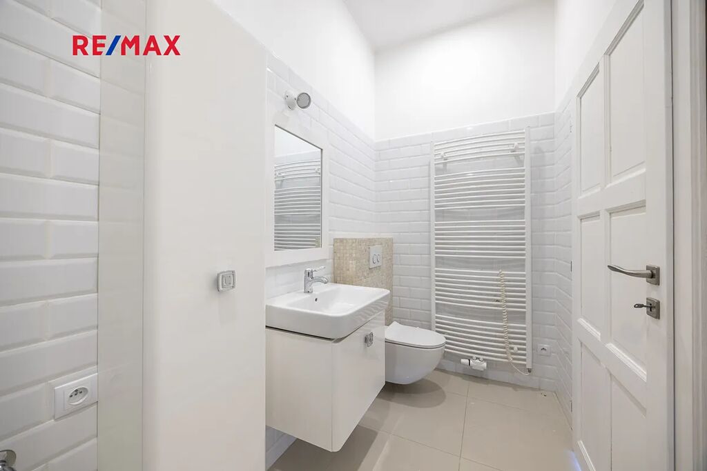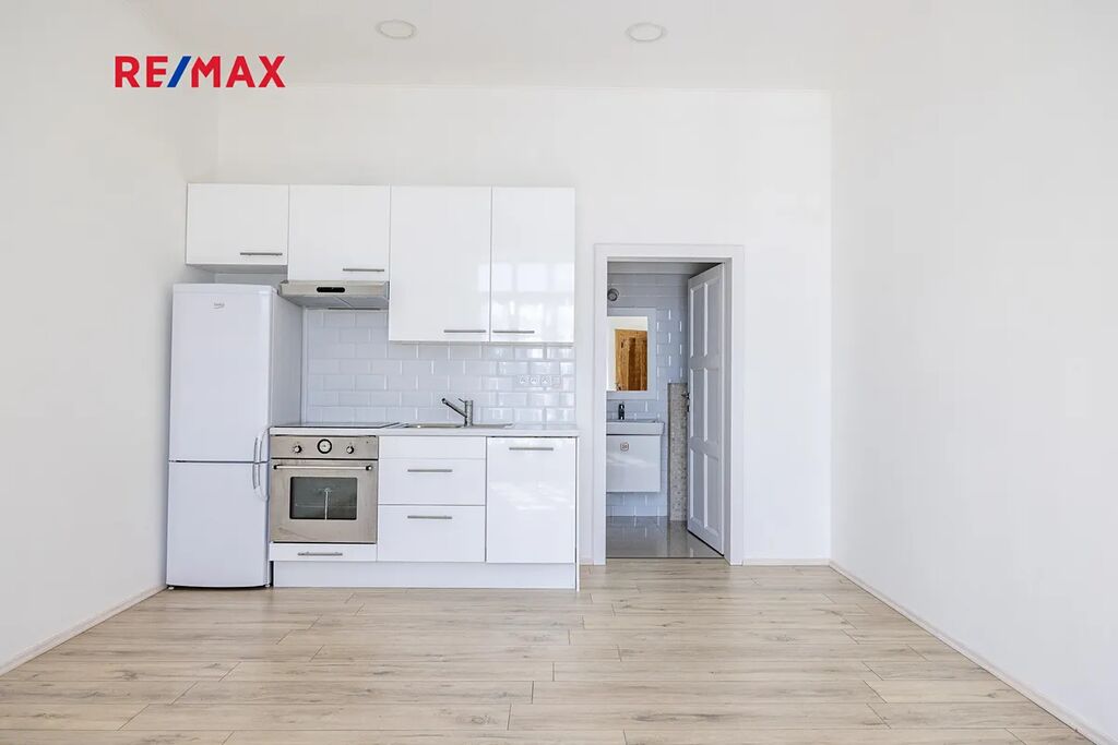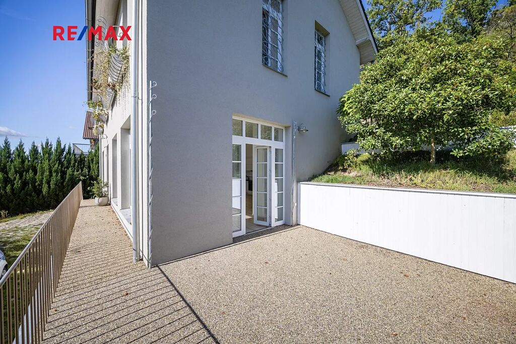 Přízemí: prostorný ateliér s kuchyňským koutem a koupelnou s WC, přímý vstup na velkou terasu o velikosti 33 m² a další bytová jednotka 1+kk s koupelnou a WC.