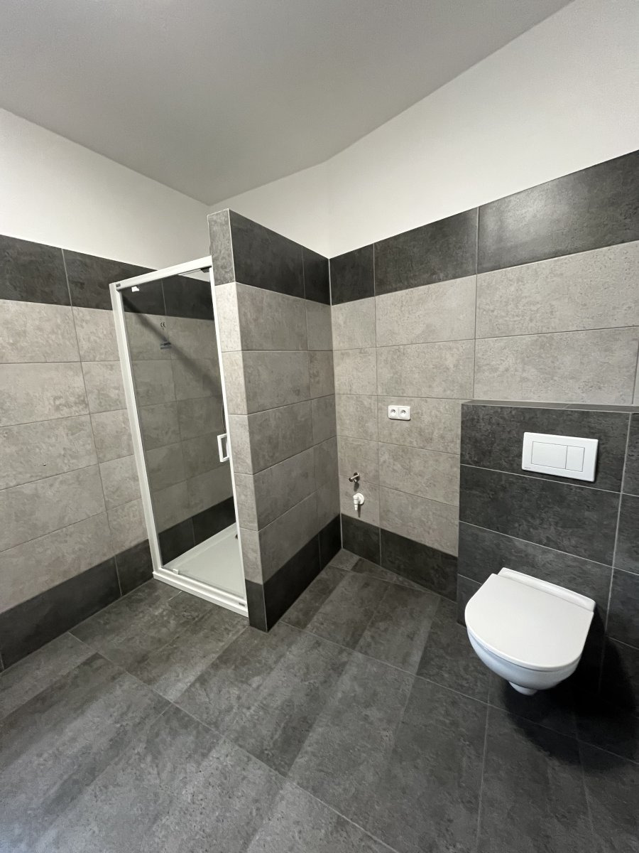 Při vstupu do bytu uvidíte prostornou chodbu s úložným prostorem a vstupy do jednotlivých místností. Dispozice nabízí velkou koupelnu s umyvadlem, sprchovým koutem, místem pro pračku se sušičkou a toaletu.