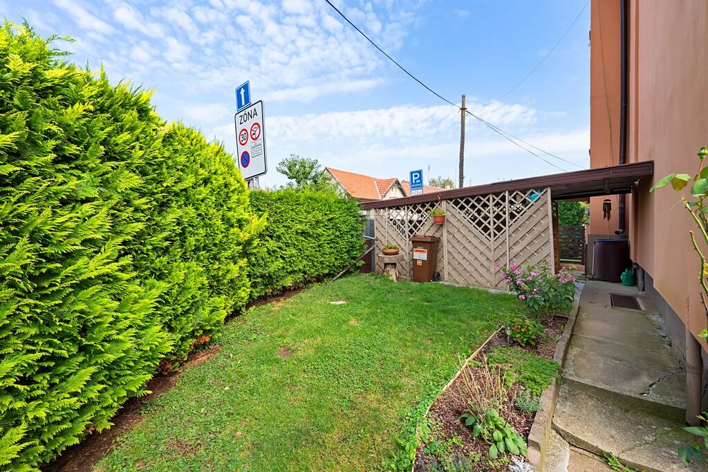Byt sestává z obývacího pokoje s kuchyňským koutem, dvou ložnic, kde u obývacího pokoje se nachází terasa o výměře 13,4 m2, u jedné ložnice balkon o výměře 3 m2, koupelna s vanou, umyvadlem a WC a předsíň. Zahrada se zastřešeným parkovacím stáním o výměře 74 m2.