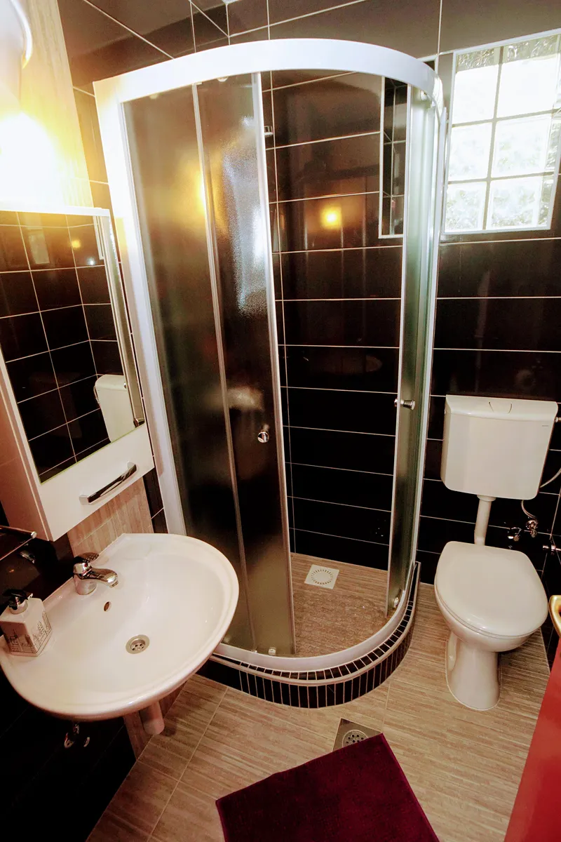 V přízemí domu se nachází jednopokojový apartmán o rozloze 66,37 m2 + terasa o ploše 9,878 m2. Vnitřní schodiště vede do 1. patra o rozloze 53,30 m2 kde je dvoupokojový apartmán s terasou 9,40 m2 a balkonem 18,64 m2. Vnější schodiště vede do podkroví o rozloze 50,26 m2 kde se nachází další dvoupokojový apartmán s prostornou terasou 20,32 m2. Na dvoře je samostatná budova s jednopokojovým apartmánem o rozloze 29,90 m2. Vše je kompletně zařízené, klimatizované, připravené k nastěhování. Jsou instalovány solární panely pro vlastní výrobu elektřiny, což zajišťuje značné úspory energie. V přízemí budovy se nachází krytá terasa o velikosti 20 m2 s nádvořím. Na pěkně upraveném pozemku o velikosti 1011 m2 můžete strávit krásné chvíle u grilu s přáteli. Na pozemku lze parkovat 4 vozidla.