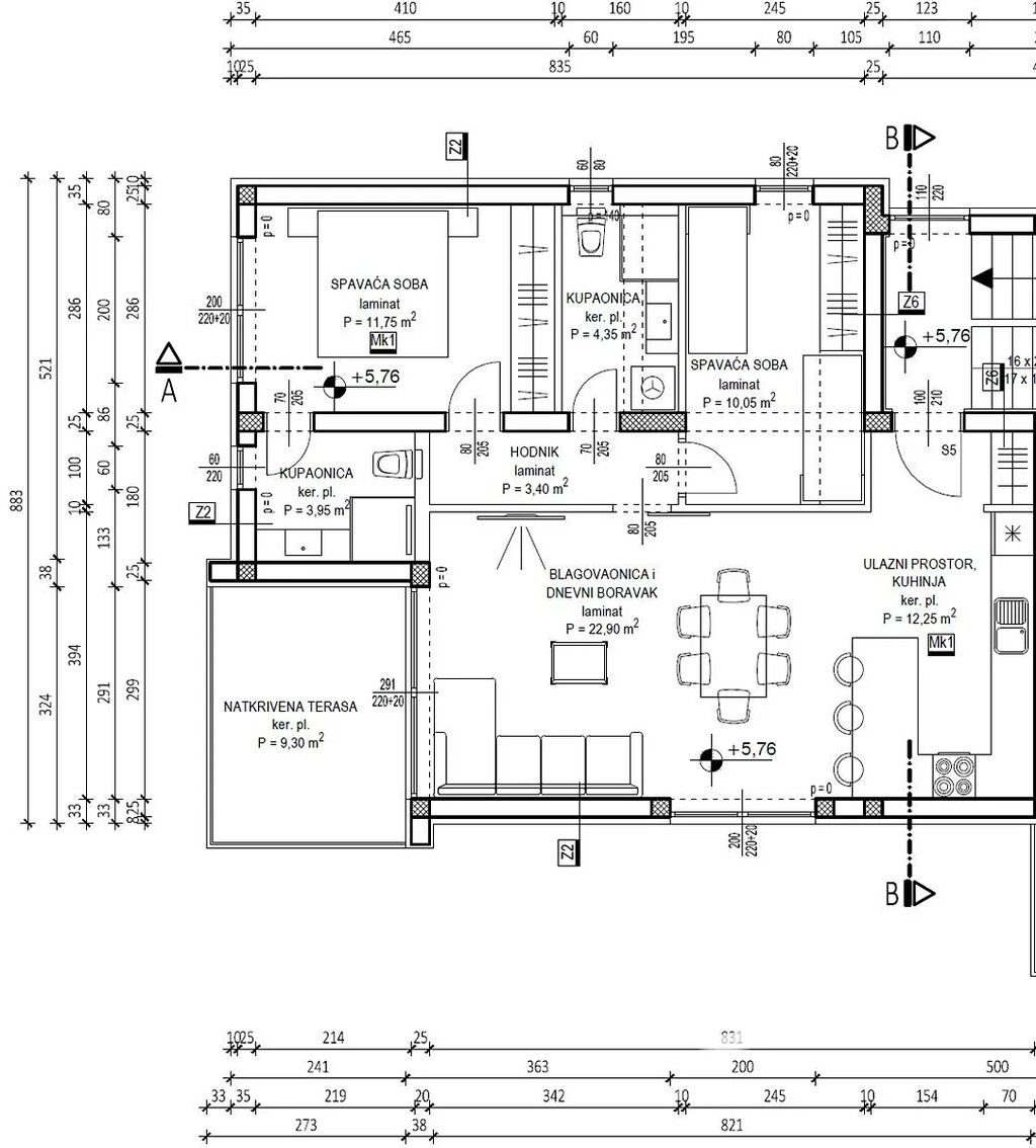 Celková užitná plocha tohoto apartmánu včetně příslušenství činí 94,71 m². Budova se skládá pouze z 6 bytů, což zajišťuje klidné a exkluzivní bydlení. Stavba byla provedena z kvalitních tepelných cihelných bloků a je vybavena tepelnou izolací. Byt je vybaven klimatizací v obývacím pokoji i ložnicích a elektrickým podlahovým vytápěním. Vstupní dveře jsou bezpečnostní a protipožární.