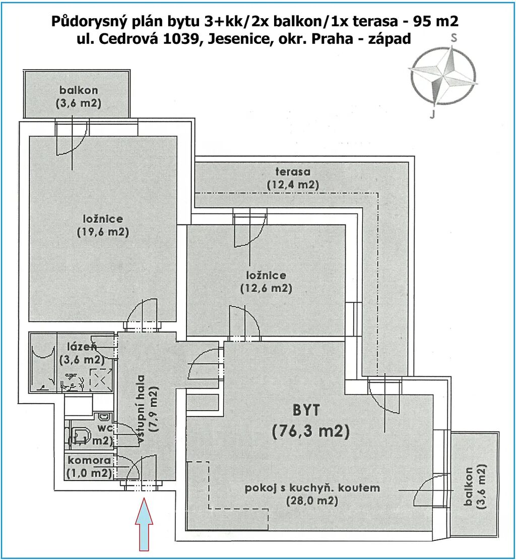 Exkluzivně nabízíme k prodeji moderní bytovou jednotku o dispozici 3+kk s terasou, dvěma balkony a venkovním parkovacím stáním, situovanou ve 4. NP bytového domu z r. 2007 v Jesenici u Prahy, ul. Cedrová. Celková plocha bytu 95 m2 (bez parkovacího stání, vč. terasy – 12,4 m2, balkon I. – 3,6 m2, balkon II – 3,6 m2). Bytová plocha 75 m2.