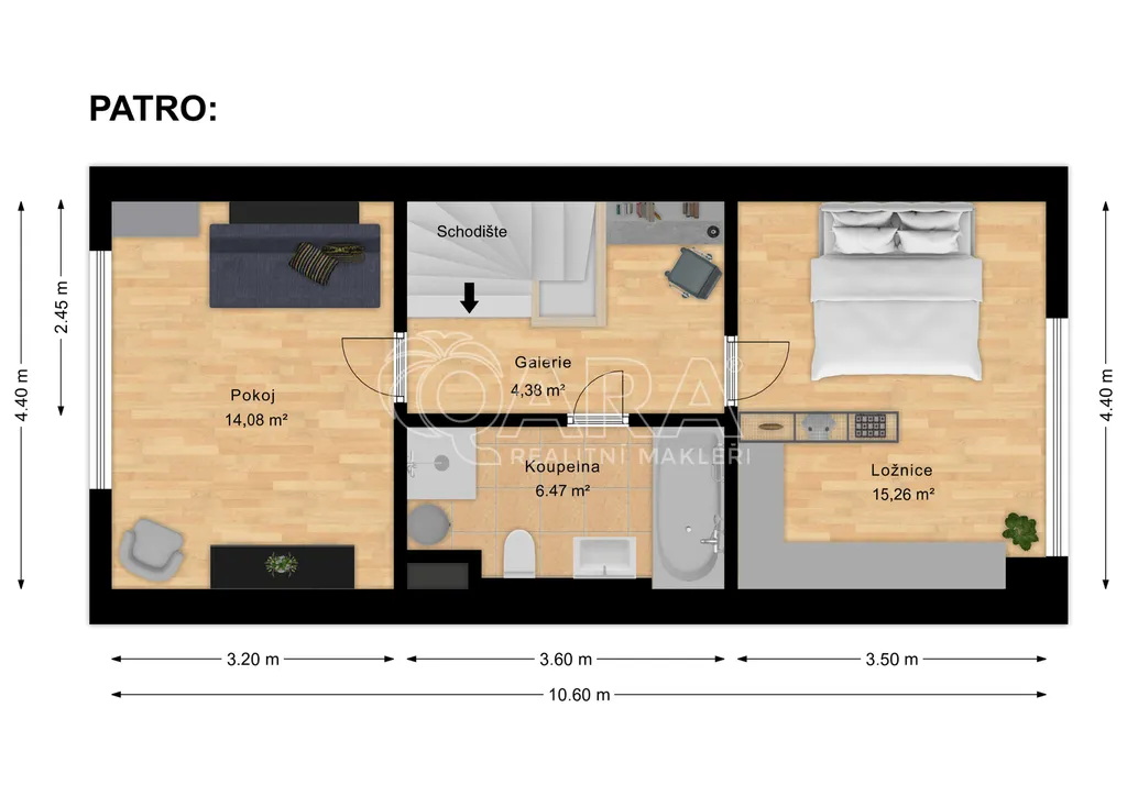 Součástí přízemí je plně vybavený kuchyňský kout, samostatná toaleta a úložný prostor. Z obývacího pokoje v přízemí se po schodišti dostanete do podkroví, kde se nachází dva samostatné pokoje, koupelna se sprchovým koutem, vanou i WC a šikovně vyřešený pracovní kout na galerii nad schodištěm.