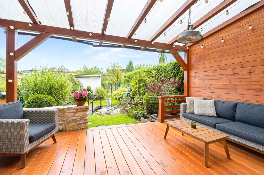 Přes zádveří se vstupuje do obývacího pokoje s výhledem do zahrady. Tento prostor je neskutečným bonusem celého domu, zahrada poskytuje Vašemu životu velký komfort. Pokračováním obývacího pokoje a neoficiální čtvrtou místností domu je vyhřívaná terasa, kde můžete trávit spoustu krásných večerů i v chladnějších měsících. Výhodou celého pozemku je i jeho propojení s okolím. Ze zahrady máte totiž přístup zadní brankou ven přímo do parku s nedalekým dětským hřištěm.