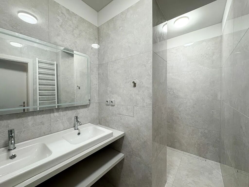 Designová koupelna – velký sprchový kout, dvě umyvadla, podsvícené zrcadlo, designové obklady