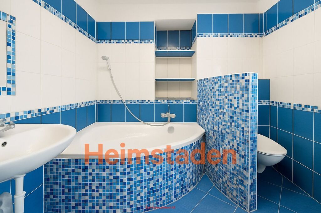 Koupelna je elegantní a promyšlená do posledního detailu – nechybí rohová vana, která přímo vybízí k večernímu odpočinku, a toaleta je prakticky součástí prostoru. Vše působí čistě, moderně a útulně.