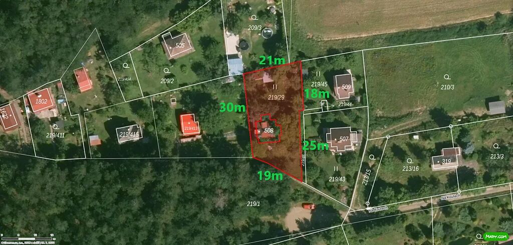 Ještě si dovolím připomenout, že v současné době se bohužel autem až na pozemek nedostanete, auto se parkuje vedle na jižním okraji na obecním pozemku č. 219/1, což je vidět na fotografiích a příjezdová cesta ulicí Na Koutech vede přes soukromé pozemky 214/2, 214/3 a 214/4, kde v současné době není věcné břemeno chůze a jízdy.