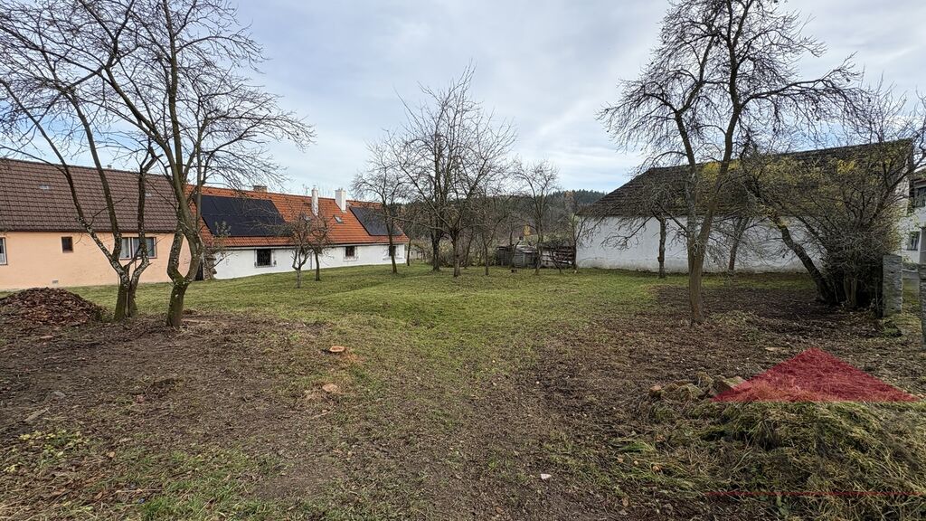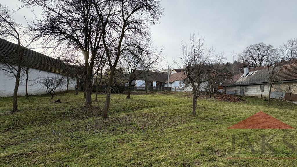 Popis a poloha: obdélníkový, slunný, mírně svažitý pozemek s ovocnými stromy, ležící ve velmi klidné původní části obce. Zděná garáž (není zapsaná v KN) v rohu u cesty = ideální zázemí pro stavbu.