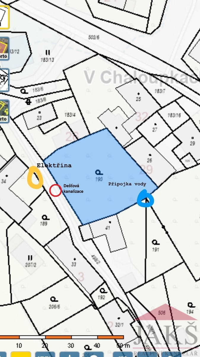 Voda: v dosahu; možnost napojení na vodovodní řad (obchodní družstvo Soběšice) v rohu poz.;