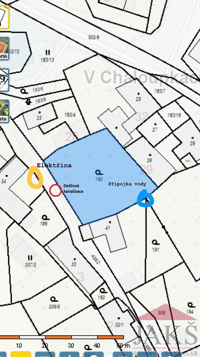 Voda: v dosahu; možnost napojení na vodovodní řad (OD Soběšice) v rohu poz.;