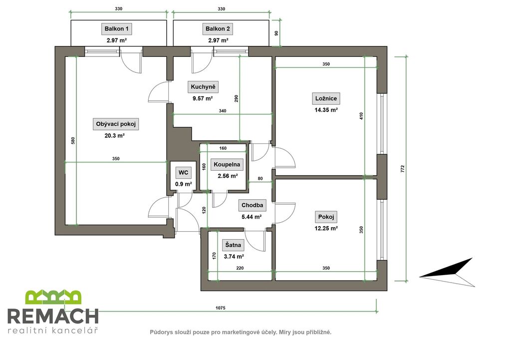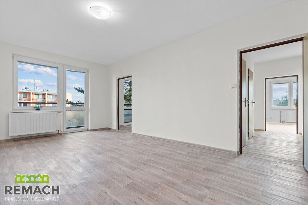 Byt nabízí prostorný obývací pokoj, dvě neprůchozí ložnice, kuchyni s jídelním prostorem, koupelnu, samostatnou toaletu a praktickou šatnu. Velkým benefitem jsou dva balkony a dvojice sklepů, které poskytují dostatek úložného místa.