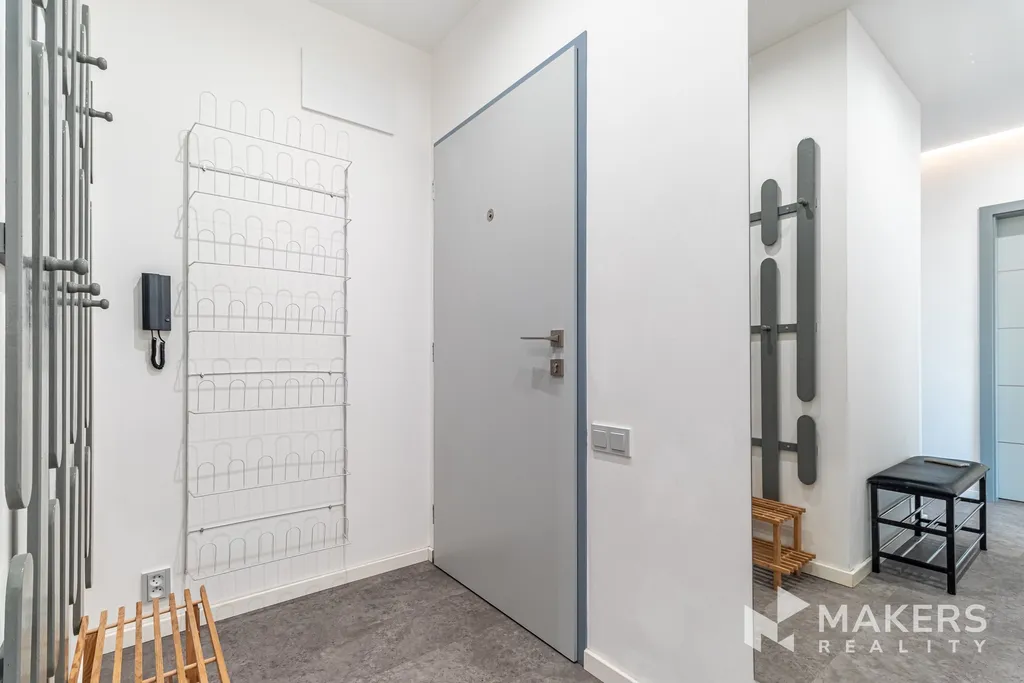 Dispozičně byt nabízí obývací pokoj se západně orientovanou lodžií, ideální pro večerní relax, dále novou sedací soupravu s elektrickým výsuvem. Hlavní ložnice disponuje vlastní walk-in šatnou a postelí, druhý pokoj orientovaný na severovýchod lze využít jako ložnici nebo pracovnu, což ocení zejména ti, kteří pracují z domova.