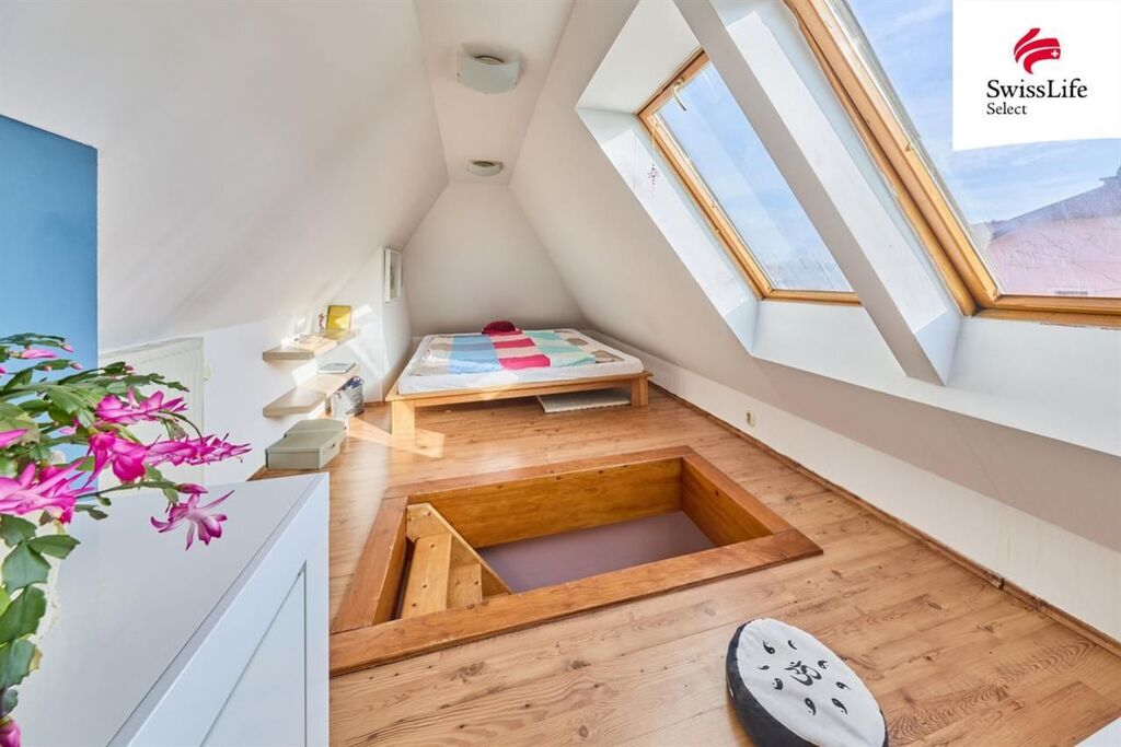 Dispozice: vstupní chodba, kuchyně s novou kuchyňskou linkou, technická místnost, koupelna s vanou a WC, prostorná ložnice a obývací pokoj. Z obývacího pokoje vede schodiště do mezonetového patra, kde se nachází další samostatný pokoj. K bytu náleží také sklep.