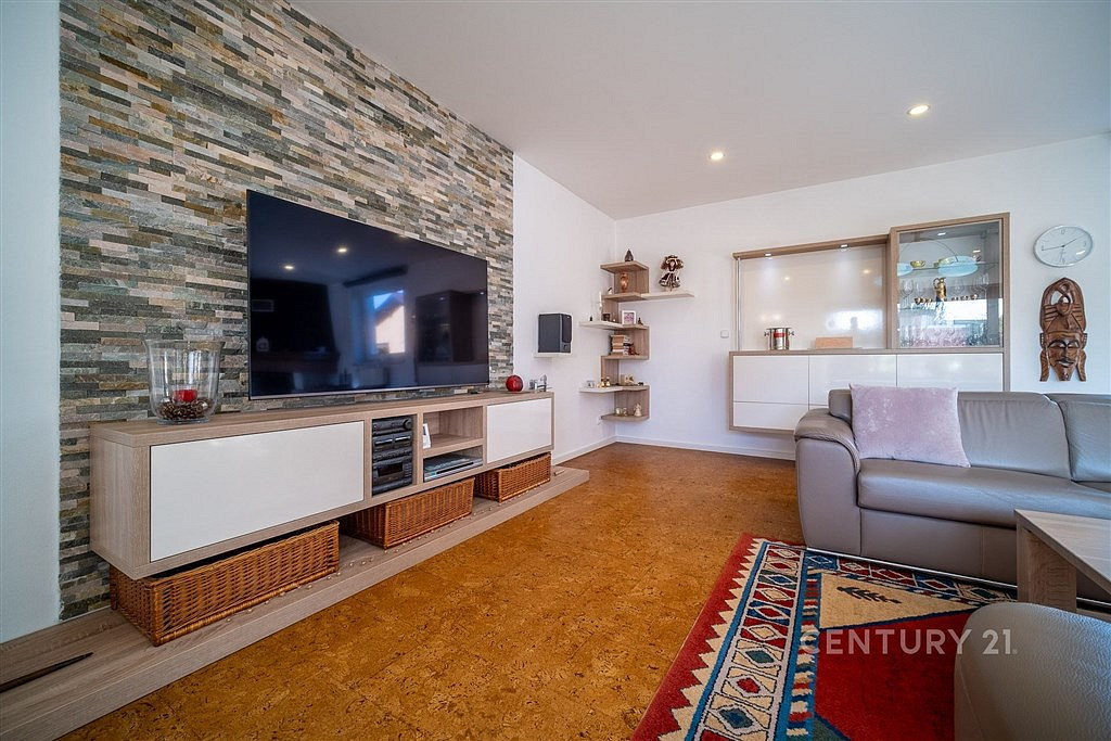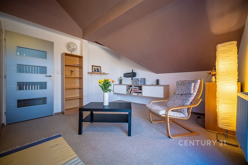 Jedná se o přízemní rodinný dům s obytným podkrovím a technickým suterénem. Dispozičně je dům řešen takto: do domu se vstupuje z kryté terasy do zádveří domu. Prostorné zádveří zajišťuje vstup do koupelny, suterénu a hlavní obytné místnosti, která je tvořena obývací pokojem (39 m²), kuchyní s jídelním koutem (25 m²) a praktickou komorou (6,85 m²). Obývák je prosvětlen velkou okenní sestavou a jeho součástí je krbová vložka. Kuchyně je vybavena moderní kuchyňskou linkou s vestavenými spotřebiči a jídelním stolem pro celou rodinu. Podkroví je přístupné po schodišti a nejdete zde koupelnu, ložnice (25 m²) s přímým vstupem na balkon a velký pokoj (22 m²), který lze rozdělit na dva menší dětské pokoje.