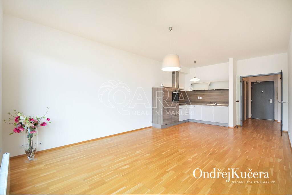Byt má samostatnou ložnici a velký obývací pokoj. Z obou místností je vstup na balkon 4,5 m², který je orientovaný na západ. Všude jsou hliníková okna s předokenními roletami a podlahy z dřevěného masivu. Kuchyňská linka je plně vybavená veškerými spotřebiči a v koupelně je pračka. V praktické komoře jsou police a na chodbě bytu velká vestavěná skříň. K bytu nenáleží žádný sklep, ani garážové stání, ale občas je možné jej zajistit v rámci poptávky a nabídky přímo v domě na recepci.