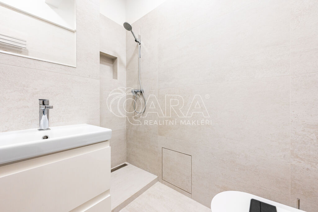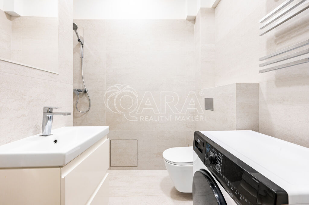 Dispozice bytu je promyšlená a funkční: vstupní chodba, vzdušný obytný prostor s manželskou postelí, moderní kuchyňský kout, praktická komora a elegantní koupelna se sprchovým koutem a toaletou. K bytu náleží také čerstvě zrekonstruovaný sklep. Součástí pronájmu je i možnost využívat sdílený balkón.