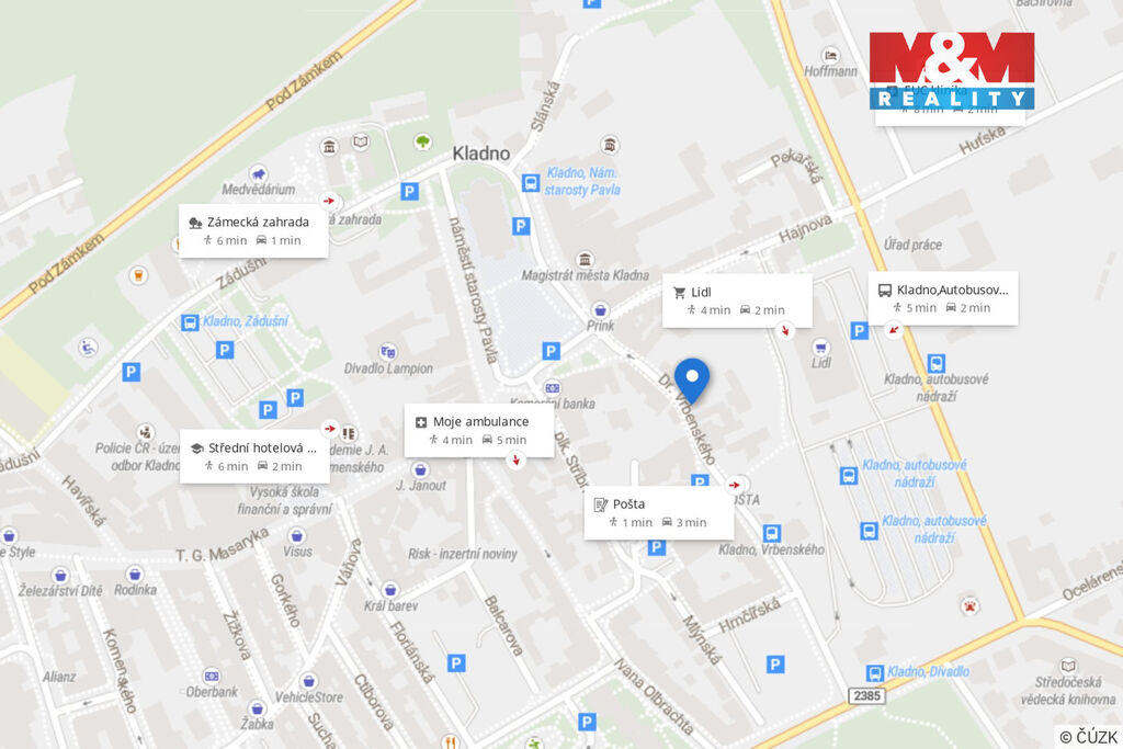 Tato nemovitost se nachází v centru Kladna pár kroků od historického náměstí s radnicí. V okolí se nahází restaurace, obchody, pošta, autobusové nádraží a další služby.