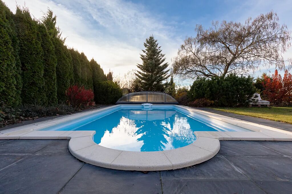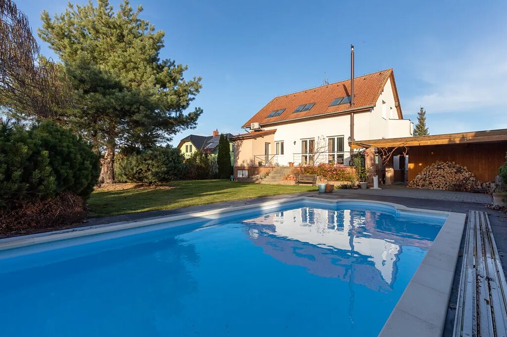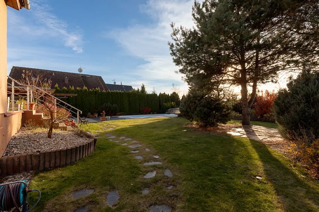 Prostorný rodinný dům s velkou zahradou, terasami, bazénem, venkovním krytým stáním pro dvě auta a garáží – ideální pro rodinu, která hledá nadstandardní bydlení.
