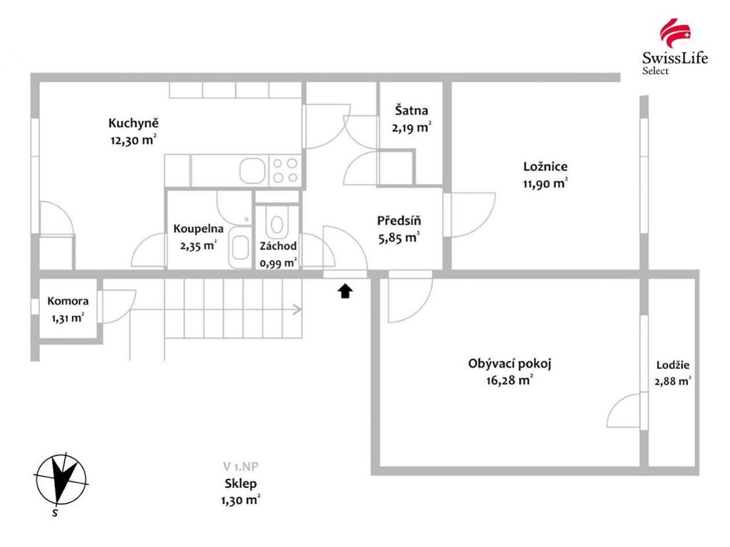 Užitná plocha bytu činí 53,17 m. Dispozičně je prostor řešen následovně: obývací pokoj 16,28 m, ložnice 11,90 m, kuchyň 12,30 m, předsíň 5,85 m, koupelna 2,35 m, samostatné WC 0,99 m, šatna 2,19 m a komora 1,31 m umístěná na společné chodbě. Součástí je také lodžie s výsuvnou markýzou o výměře 2,88 m a sklepní kóje 1,30 m v suterénu.