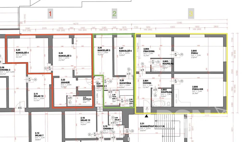 Dispozice 2+1 zahrnuje dva oddělené prostorné pokoje (26 m2 a 27 m2), samostatnou kuchyni s prostorem pro jídelní stůl, dvě koupelny se sprchovým koutem a toaletou (toaleta pouze 1x) a vstupní chodbu. Díky velkým oknům je prostor světlý a působí velmi příjemně.