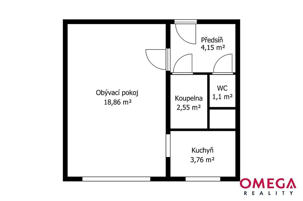 Výměry jednotlivých prostor: obývací pokoj 18,37 m2, kuchyňský kout 3,60 m2, předsíň 3,74 m2, koupelna 2,24 m2, samostatné WC 0,90 m2, sklep 1,05 m2.