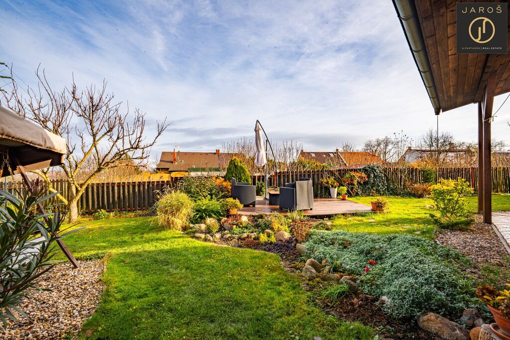 Součástí pozemku je také dvougaráž o ploše cca 40 m², částečně podsklepená – vhodná např. pro skladování potravin nebo nářadí. Zahrada je zatravněná a osázená okrasnými i ovocnými stromy, doplněná o kolny pro uskladnění dřeva či zahradní techniky.