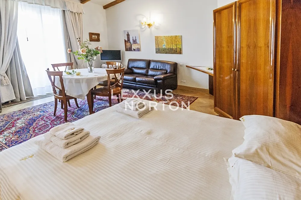 Ve čtvrtém patře bytového projektu je situován tento reprezentativní, zařízený byt 1+kk k pronájmu, disponující velkorysou obytnou plochou celých 38 m2. Útulný interiér se sestává ze vstupní chodby a reprezentativního, prakticky řešeného obývacího pokoje s ložnicovou zónou, jídelním koutem a moderně vybaveným kuchyňským koutem a 1 koupelnou. Z obývacího pokoje je uzpůsoben vstup na balkon. Možnost pronájmu garážové stání za příplatek 5000 CZK + DPH a užívání společné zahrady a bazénu.