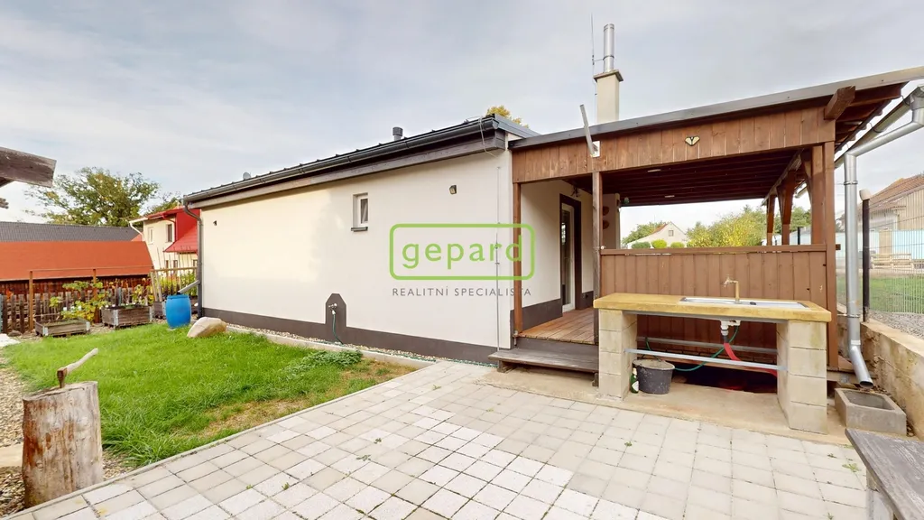 Na zahradě je k dispozici garáž poskytující parkování i úložný prostor, dále suchá toaleta s elektřinou pro pohodlné používání při práci kolem domu a dešťová nádoba o objemu 1,2 m³, zakopaná v zemi, která nezasahuje do terénu ani nenarušuje vzhled pozemku.