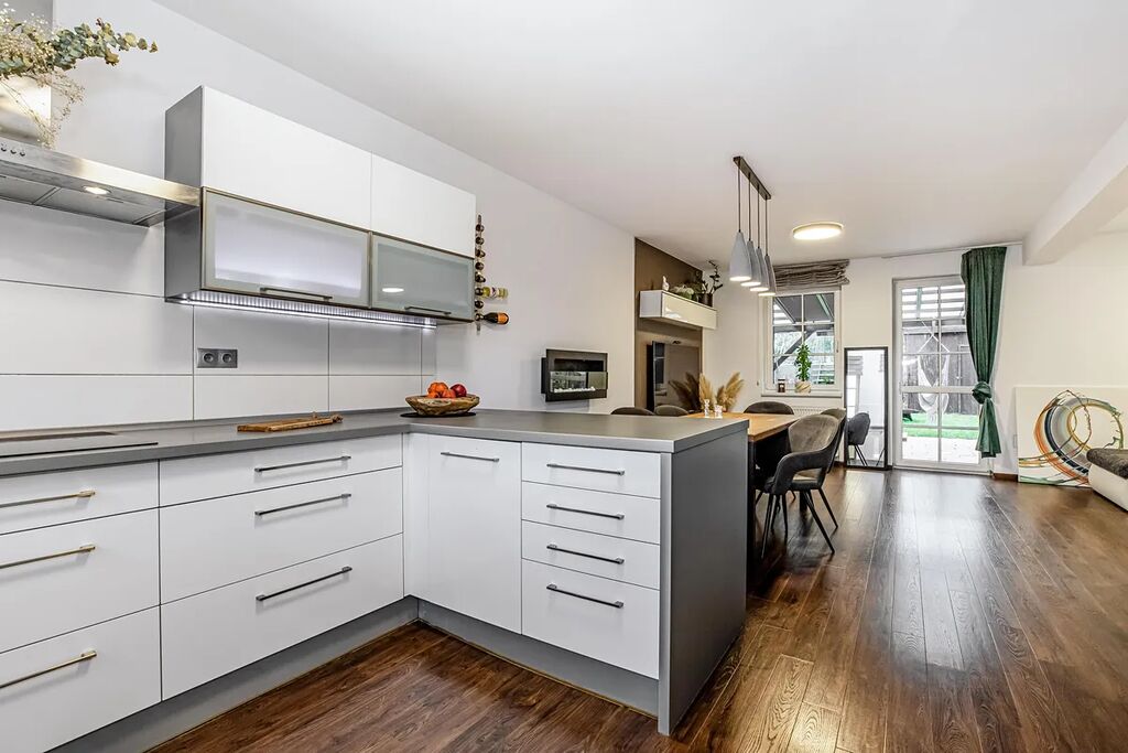 Prostorný obývací pokoj propojený s plně vybavenou kuchyní